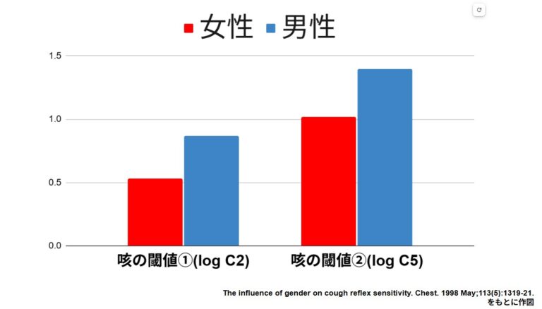 女性は咳の感受性の高いと言われております。これは「咳反射の閾値が低い」ためです。「咳反射閾値」とは、カプサイシンなどの刺激で咳が誘発されるまでの感度を示す指標です。多くの研究で、**女性は男性よりも咳反射閾値が低い(つまり、刺激に敏感)**ことが明らかになっています。4)