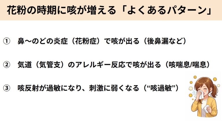 花粉シーズン(スギ・ヒノキ・イネ科など)に咳が増える方は少なくありません。背景には大きく分けて次の3つが関わります。